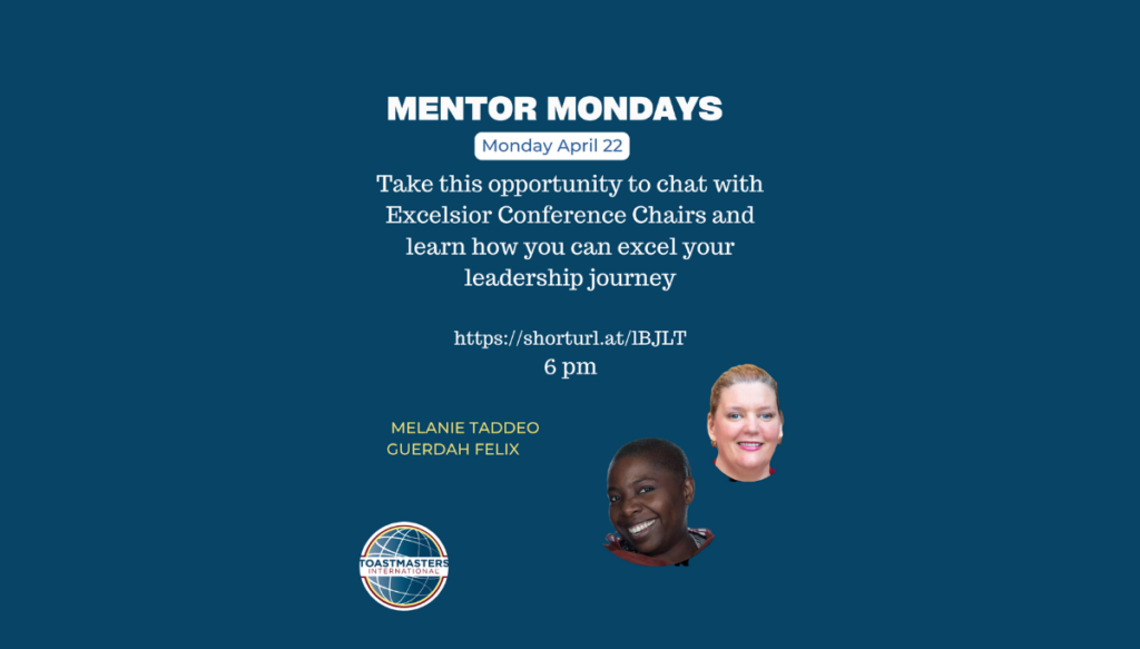Our guests are 2024 Excelsior Spring Conference Co-Chairs, Melanie Taddeo DTM and Guerdah Felix DTM These two ladies are full of energy and enthusiasm. Their top-notch organizational and leadership skills gave us a chance to learn and sample an incredible variety of Toastmasters skills. Melanie’s and Guerdah”s passion for Toastmasters shows but even more is their passion for you to step into their shoes and serve as a Chair or Co-Chair to build your conference dream.